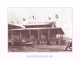 [3] L’edifici dels BANYS COLON i l’entorn del PARC han sofert diferents modificacions al llarg dels anys. L’any 1881 va ser construït per Pau Mercader i Joan Pigrau, amb autorització a precari concedida per l’Ajuntament i per l’Estat que, el 24 de juliol de 1894, la va legalitzar en forma de concessió administrativa indefinida. L’interior de l’establiment, definit perfectament pel relat del Dr.Salarich, s’aixoplugava dins una edificació de planta rectangular feta d’obra, amb coberta de teules a dues aigües i una porxada de fusta que envoltava les façanes del cos central.